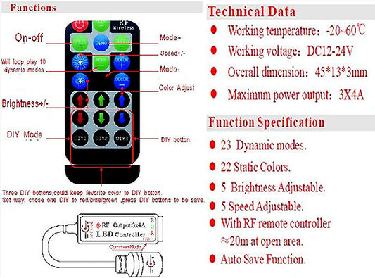 Mini RF WIRELESS LED RGB Controller For LED RGB STRIPS/ BARS 23 DYNAMIC MODES/22 STATIC COLORS/5 BRIGHTNESS ADJUSTMENT/5 SPEED ADJUSTMENTS/ 20M/65FT RANGE